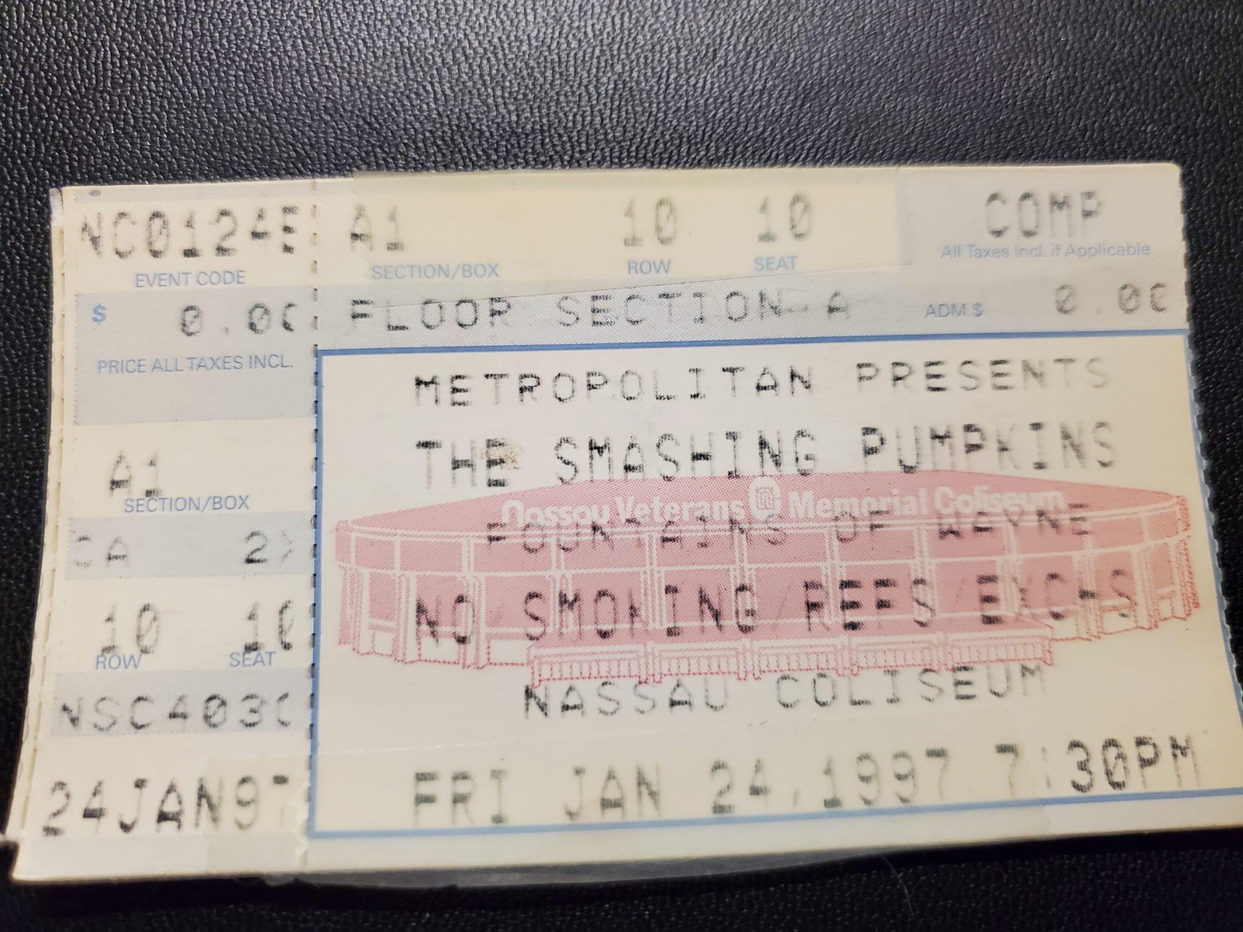 I decided to go and try to get tickets for the show at the Nassau Coliseum on 1/24/97 along with my girlfriend and got extremely lucky when a girl told us she had tickets. She said she wouldn’t take any money and gave us two free tickets. She said we might was well follow her and during all the excitement I didn’t even notice where the seats were located. We wound up walking down to the stage level and the seats were on the 10th row. The girl explained she got the tickets for free since she worked for the Ford Modeling agency. When I sat down I was sitting next to Helena Christensen who I recognized since she was very famous at the time. I knew she was dating Billy Corgan and during the whole show Billy would constantly look at her.